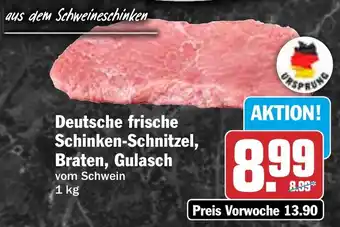 Jetzt im Angebot bei HIT: Deutsche frische Schinken-Schnitzel, aus dem Schweineschinken Braten, Gulasch ✅ Aktion gültig vom 22-12 bis 27-12.