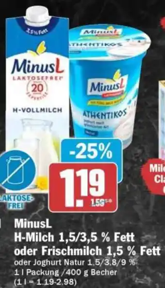 MinusL H-Milch 1,5/3,5 % Fett oder Frischmilch 1,5 % Fett oder Joghurt Natur Angebote und Online Aktionen direkt aus dem aktuellen HIT Angebot