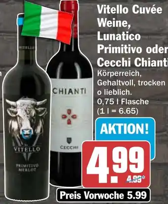 Jetzt im Angebot bei HIT: Vitello Cuvée Weine, Lunatico Primitivo oder Cecchi Chianti ✅ Aktion gültig vom 26-01 bis 31-01.