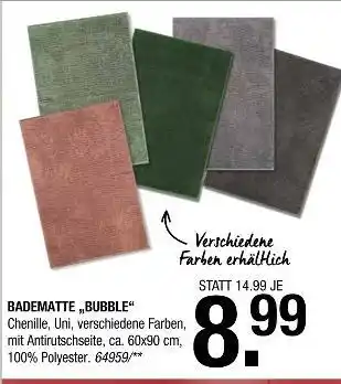 Das Angebot ist in verschiedenen Geschäften erhältlich. Schauen Sie sich alle Produkte an, um das günstigste Badematte 'bubble' zu ergattern. Wenn Sie gerne nachschauen möchten, ob der Artikel woanders noch günstiger ist, werfen Sie einen Blick auf die Kategorie 'Küchen und Badezimmer'. Möglicherweise sind diese Angebote auch interessant für Sie: Mexx Badematte, Livarno badematte & MEXX Badematte.