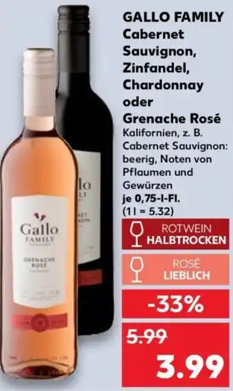 Jetzt im Angebot bei Kaufland: GALLO FAMILY Cabernet Sauvignon, Zinfandel, Chardonnay oder Grenache Rosé ✅ Aktion gültig vom 19-02 bis 25-02.