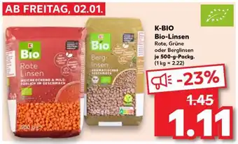 Jetzt im Angebot bei Kaufland: K-BIO Bio-Linsen ✅ Aktion gültig vom 2-01 bis 7-01.