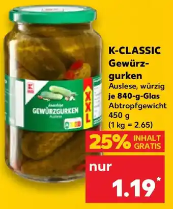 Jetzt im Angebot bei Kaufland: K-CLASSIC Gewürzgurken ✅ Aktion gültig vom 25-01 bis 28-01.