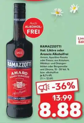 Abgesehen von Ramazzotti, bietet Kaufland eine Menge anderer Artikel an. Behalten Sie den wöchentlichen Kaufland Prospekt im Blick, um die besten Angebote und Aktionen nicht zu verpassen. Abgesehen von Ramazzotti können Sie weitere, interessante Angebote entdecken: Ramazzotti Kräuterlikör, Ramazzotti amaro & RAMAZZOTTI Crema Cappuccino.