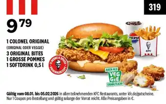 Jetzt im Angebot bei KFC: 1 COLONEL ORIGINAL (ORIGINAL ODER VEGGIE) 3 ORIGINAL BITES 1 GROSSE POMMES 1 SOFTDRINK 0,5 | ✅ Aktion gültig vom 7-01 bis 5-02.