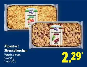 Jetzt im Angebot bei Lidl: Alpenfest Streuselkuchen ✅ Aktion gültig vom 12-01 bis 17-01.