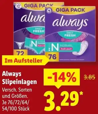 Werfen Sie einen Blick auf die günstigsten Produkte zwischen all den Angeboten! Wenn Sie gerne wissen möchten, ob Lidl die höchsten Rabatte für Always Slipeinlagen anbietet, vergleichen Sie die Angebote ganz einfach auf der Startseite mit den anderen Geschäften.