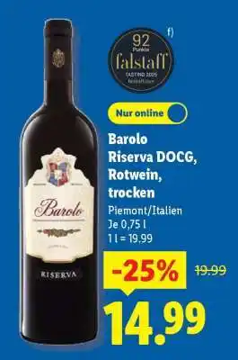 Jetzt im Angebot bei Lidl: Barolo Riserva DOCG, Rotwein, trocken ✅ Aktion gültig vom 19-01 bis 24-01.