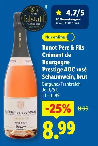Jetzt im Angebot bei Lidl: Bonot Père & Fils Crémant de Bourgogneg Prestige AOC rosé Schaumwein, brut ✅ Aktion gültig vom 16-02 bis 22-02.