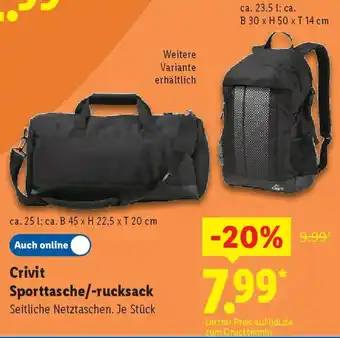Jetzt im Angebot bei Lidl: Crivit Sporttasche/-rucksack ✅ Aktion gültig vom 29-12 bis 3-01.