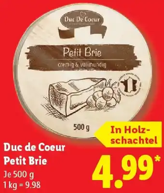 Jetzt im Angebot bei Lidl: Duc de Coeur Petit Brie ✅ Aktion gültig vom 16-02 bis 22-02.