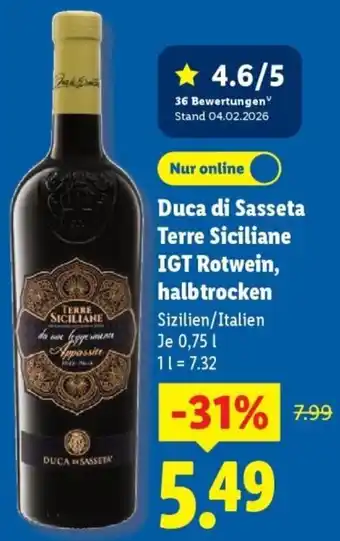 Den Preis von dem Duca di Sasseta Terre Siciliane IGT Rotwein, halbtrocken finden Sie auch oben auf der Website, zusammen mit dem Datum, ab wann das Angebot erhältlich ist. Sie können die Preise auch im aktuellen Lidl Prospekt nachhalten oder auf der Lidl Website nachschauen. Durch die Angebote können Sie sicher sein, die Lidl Produkte zum absoluten Bestpreis zu ergattern.