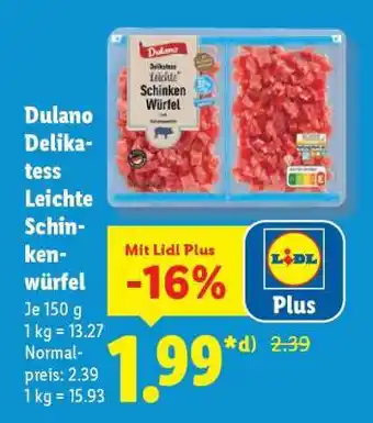 Jetzt im Angebot bei Lidl: Dulano Delikatess Leichte Schinkenwürfel ✅ Aktion gültig vom 12-01 bis 17-01.