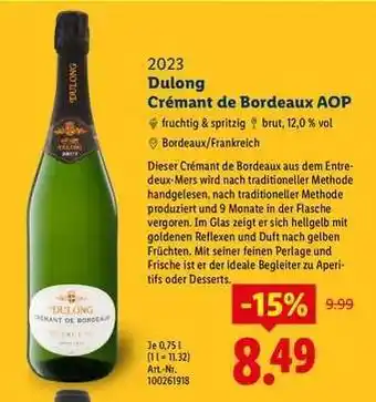 Jetzt im Angebot bei Lidl: Dulong Crémant de Bordeaux AOP ✅ Aktion gültig vom 1-03 bis 31-03.