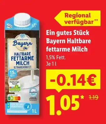 Jetzt im Angebot bei Lidl: Ein gutes stück bayern haltbare fettarme milch ✅ Aktion gültig vom 1-03 bis 31-12.