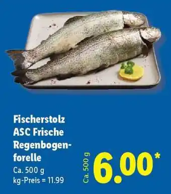 Jetzt im Angebot bei Lidl: Fischerstolz ASC Frische Regenbogenforelle ✅ Aktion gültig vom 16-02 bis 21-02.