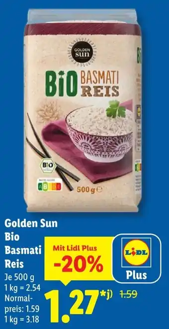 Jetzt im Angebot bei Lidl: Golden Sun Bio Basmati Reis ✅ Aktion gültig vom 2-03 bis 8-03.