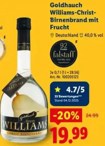 Jetzt im Angebot bei Lidl: Goldhauch Williams-Christ Birnenbrand mit Frucht ✅ Aktion gültig vom 1-01 bis 31-01.