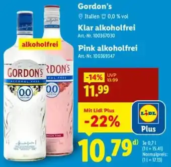 Jetzt im Angebot bei Lidl: Gordon's Klar alkoholfrei oder Pink alkoholfrei ✅ Aktion gültig vom 1-01 bis 31-01.