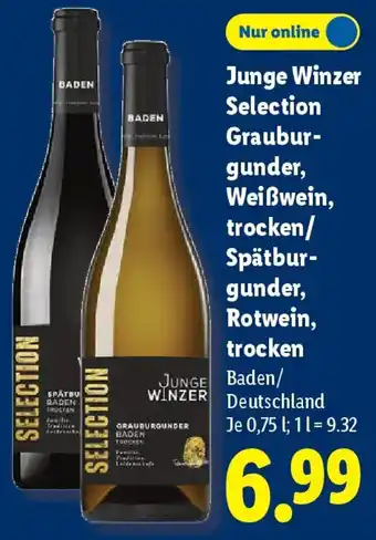 Jetzt im Angebot bei Lidl: Junge Winzer Selection Grauburgunder, Weißwein, trocken/ Spätburgunder, Rotwein, trocken ✅ Aktion gültig vom 11-01 bis 17-01.