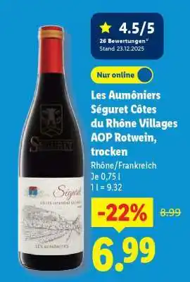 Jetzt im Angebot bei Lidl: Les Aumôniers Séguret Côtes du Rhône Villages AOP Rotwein, trocken ✅ Aktion gültig vom 16-02 bis 21-02.