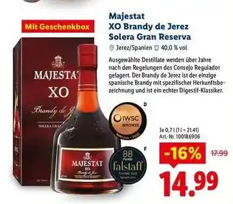 Jetzt im Angebot bei Lidl: Majestat XO Brandy de Jerez Solera Gran Reserva ✅ Aktion gültig vom 1-03 bis 31-03.