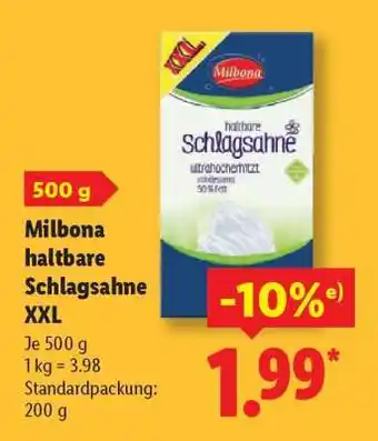 Jetzt im Angebot bei Lidl: Milbona Haltbare Schlagsahne XXL ✅ Aktion gültig vom 5-01 bis 10-01.