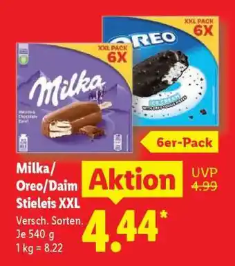 Jetzt im Angebot bei Lidl: Milka/Oreo/Daim Stieleis XXL ✅ Aktion gültig vom 23-02 bis 28-02.