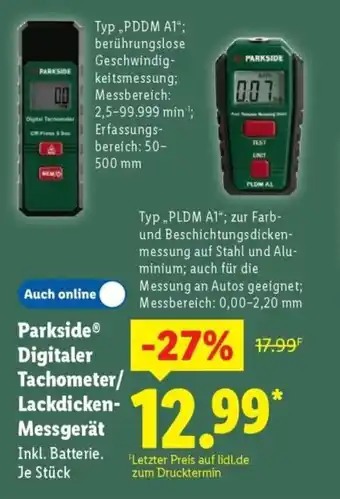 Den Preis von dem Parkside Digitaler Tachometer/ Lackdicken- Messgerät finden Sie auch oben auf der Website, zusammen mit dem Datum, ab wann das Angebot erhältlich ist. Sie können die Preise auch im aktuellen Lidl Prospekt nachhalten oder auf der Lidl Website nachschauen. Durch die Angebote können Sie sicher sein, die Lidl Produkte zum absoluten Bestpreis zu ergattern.