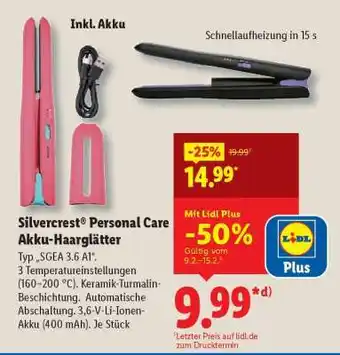 SILVERCREST PERSONAL CARE Akku-Haarglätter ist jetzt im Angebot bei Lidl, gültig vom 09-02-2026 bis 14-02-2026. Besuchen Sie die Website von Lidl oder kaufen Sie SILVERCREST PERSONAL CARE Akku-Haarglätter direkt im Geschäft. Auf Prospektangebote.de finden Sie immer die besten aktuellen Aktionen. Vergleichen Sie SILVERCREST PERSONAL CARE Akku-Haarglätter mit anderen Angeboten und prüfen Sie, ob sich ein Kauf jetzt lohnt. Behalten Sie kommende Aktionen im Blick, denn manche Produkte sind nur nächste Woche oder nur vor Ort verfügbar.Häufig gestellte Fragen über SILVERCREST PERSONAL CARE Akku-Haarglätter