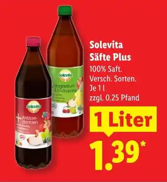 Diese Woche ist Solevita Säfte Plus bei Lidl reduziert erhältlich. Hier finden Sie alle Informationen zu Preisen, Aktionsdetails und Laufzeit. Prüfen Sie weitere Solevita Säfte Plus Aktionen, um sicherzugehen, dass Sie den besten Preis erhalten. Die Solevita Säfte Plus Aktion gilt in Kalenderwoche 08. Nach Ablauf zeigen wir Ihnen vergleichbare Alternativen. Abonnieren Sie die Kategorie, um beim nächsten Mal direkt informiert zu sein, wenn Solevita Säfte Plus wieder reduziert ist.Häufig gestellte Fragen über Solevita Säfte Plus