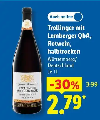Jetzt im Angebot bei Lidl: Trollinger mit lemberger qba, rotwein, halbtrocken ✅ Aktion gültig vom 12-04 bis 18-04.