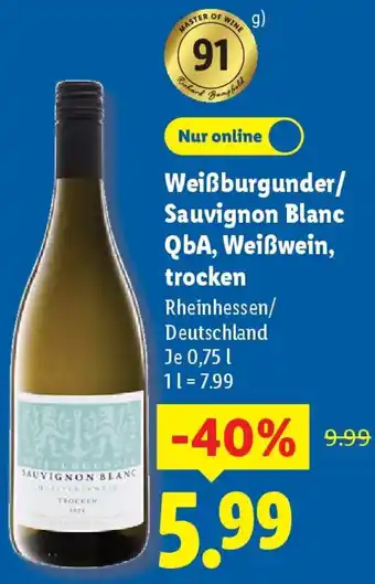 Jetzt im Angebot bei Lidl: Weißburgunder/ Sauvignon Blanc QbA, Weißwein, trocken ✅ Aktion gültig vom 11-01 bis 17-01.