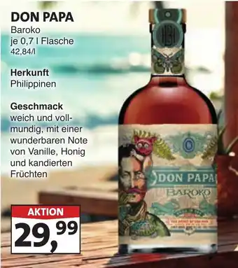 Abgesehen von DON PAPA Baroko, bietet Lösch Depot eine Menge anderer Artikel an. Behalten Sie den wöchentlichen Lösch Depot Prospekt im Blick, um die besten Angebote und Aktionen nicht zu verpassen. Abgesehen von DON PAPA Baroko können Sie weitere, interessante Angebote entdecken: Don papa barocko, Don Bernardo Manchego & Don Silvestre Sauvignon Blanc.