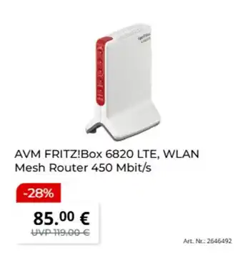 AVM FRITZ!Box 6820 LTE, WLAN Mesh Router 450 Mbit/s ist jetzt im Angebot bei MediaMarkt, gültig vom 09-03-2026 bis 22-03-2026. Besuchen Sie die Website von MediaMarkt oder kaufen Sie AVM FRITZ!Box 6820 LTE, WLAN Mesh Router 450 Mbit/s direkt im Geschäft. Auf Prospektangebote.de finden Sie immer die besten aktuellen Aktionen. Vergleichen Sie AVM FRITZ!Box 6820 LTE, WLAN Mesh Router 450 Mbit/s mit anderen Angeboten und prüfen Sie, ob sich ein Kauf jetzt lohnt. Behalten Sie kommende Aktionen im Blick, denn manche Produkte sind nur nächste Woche oder nur vor Ort verfügbar.Häufig gestellte Fragen über AVM FRITZ!Box 6820 LTE, WLAN Mesh Router 450 Mbit/s
