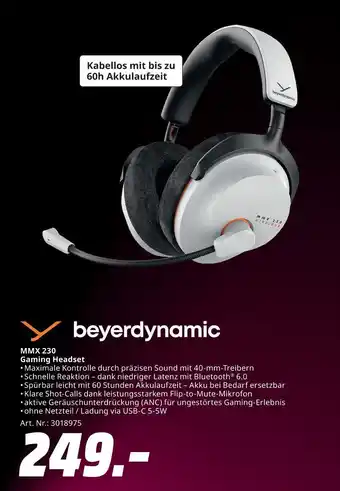 Den Preis von dem beyerdynamic MM X 230 WIRELESS MMX 230 Gaming Headset finden Sie auch oben auf der Website, zusammen mit dem Datum, ab wann das Angebot erhältlich ist. Sie können die Preise auch im aktuellen MediaMarkt Prospekt nachhalten oder auf der MediaMarkt Website nachschauen. Durch die Angebote können Sie sicher sein, die MediaMarkt Produkte zum absoluten Bestpreis zu ergattern.