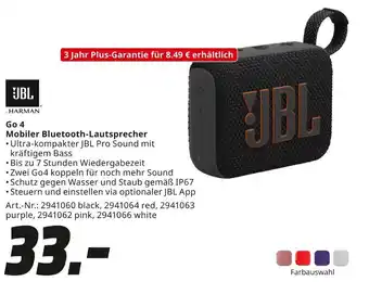 Den Preis von dem JBL Go 4 Mobiler Bluetooth-Lautsprecher finden Sie auch oben auf der Website, zusammen mit dem Datum, ab wann das Angebot erhältlich ist. Sie können die Preise auch im aktuellen MediaMarkt Prospekt nachhalten oder auf der MediaMarkt Website nachschauen. Durch die Angebote können Sie sicher sein, die MediaMarkt Produkte zum absoluten Bestpreis zu ergattern.