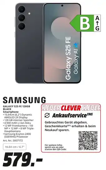 SAMSUNG GALAXY S25 FE 128GB BLACK Smartphone ist jetzt im Angebot bei MediaMarkt, gültig vom 26-02-2026 bis 03-03-2026. Besuchen Sie die Website von MediaMarkt oder kaufen Sie SAMSUNG GALAXY S25 FE 128GB BLACK Smartphone direkt im Geschäft. Auf Prospektangebote.de finden Sie immer die besten aktuellen Aktionen. Vergleichen Sie SAMSUNG GALAXY S25 FE 128GB BLACK Smartphone mit anderen Angeboten und prüfen Sie, ob sich ein Kauf jetzt lohnt. Behalten Sie kommende Aktionen im Blick, denn manche Produkte sind nur nächste Woche oder nur vor Ort verfügbar.Häufig gestellte Fragen über SAMSUNG GALAXY S25 FE 128GB BLACK Smartphone