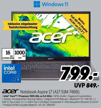 acer Notebook Aspire 17 (A17-51M-74BB) Angebote und Aktionen bei MEDIMAX