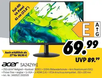 Den Preis von dem acer SA242YH1 finden Sie auch oben auf der Website, zusammen mit dem Datum, ab wann das Angebot erhältlich ist. Sie können die Preise auch im aktuellen MEDIMAX Prospekt nachhalten oder auf der MEDIMAX Website nachschauen. Durch die Angebote können Sie sicher sein, die MEDIMAX Produkte zum absoluten Bestpreis zu ergattern.