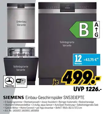 SIEMENS Einbau-Geschirrspüler SN53EIEPTE ist jetzt im Angebot bei MEDIMAX, gültig vom 18-04-2026 bis 24-04-2026. Besuchen Sie die Website von MEDIMAX oder kaufen Sie SIEMENS Einbau-Geschirrspüler SN53EIEPTE direkt im Geschäft. Auf Prospektangebote.de finden Sie immer die besten aktuellen Aktionen. Vergleichen Sie SIEMENS Einbau-Geschirrspüler SN53EIEPTE mit anderen Angeboten und prüfen Sie, ob sich ein Kauf jetzt lohnt. Behalten Sie kommende Aktionen im Blick, denn manche Produkte sind nur nächste Woche oder nur vor Ort verfügbar.Häufig gestellte Fragen über SIEMENS Einbau-Geschirrspüler SN53EIEPTE