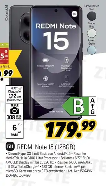 Den Preis von dem Xiaomi REDMI Note 15 (128GB) finden Sie auch oben auf der Website, zusammen mit dem Datum, ab wann das Angebot erhältlich ist. Sie können die Preise auch im aktuellen MEDIMAX Prospekt nachhalten oder auf der MEDIMAX Website nachschauen. Durch die Angebote können Sie sicher sein, die MEDIMAX Produkte zum absoluten Bestpreis zu ergattern.