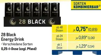 Den Preis von dem 28 Black Energy Drink finden Sie auch oben auf der Website, zusammen mit dem Datum, ab wann das Angebot erhältlich ist. Sie können die Preise auch im aktuellen METRO Prospekt nachhalten oder auf der METRO Website nachschauen. Durch die Angebote können Sie sicher sein, die METRO Produkte zum absoluten Bestpreis zu ergattern.