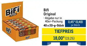 Den Preis von dem Bifi Original finden Sie auch oben auf der Website, zusammen mit dem Datum, ab wann das Angebot erhältlich ist. Sie können die Preise auch im aktuellen METRO Prospekt nachhalten oder auf der METRO Website nachschauen. Durch die Angebote können Sie sicher sein, die METRO Produkte zum absoluten Bestpreis zu ergattern.