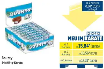 Abgesehen von Bounty, bietet METRO eine Menge anderer Artikel an. Behalten Sie den wöchentlichen METRO Prospekt im Blick, um die besten Angebote und Aktionen nicht zu verpassen. Abgesehen von Bounty können Sie weitere, interessante Angebote entdecken: Bounty, BOUNTY Schokoriegel & Mars, Snickers, Balisto, Bounty, Milky Way oder Twix.