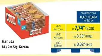 Den Preis von dem Hanuta finden Sie auch oben auf der Website, zusammen mit dem Datum, ab wann das Angebot erhältlich ist. Sie können die Preise auch im aktuellen METRO Prospekt nachhalten oder auf der METRO Website nachschauen. Durch die Angebote können Sie sicher sein, die METRO Produkte zum absoluten Bestpreis zu ergattern.