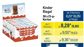 Kinder Riegel ist jetzt im Angebot bei METRO, gültig vom 01-05-2026 bis 31-05-2026. Besuchen Sie die Website von METRO oder kaufen Sie Kinder Riegel direkt im Geschäft. Auf Prospektangebote.de finden Sie immer die besten aktuellen Aktionen. Vergleichen Sie Kinder Riegel mit anderen Angeboten und prüfen Sie, ob sich ein Kauf jetzt lohnt. Behalten Sie kommende Aktionen im Blick, denn manche Produkte sind nur nächste Woche oder nur vor Ort verfügbar.Häufig gestellte Fragen über Kinder Riegel