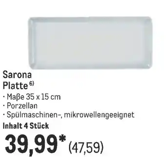 Den Preis von dem Sarona Platte finden Sie auch oben auf der Website, zusammen mit dem Datum, ab wann das Angebot erhältlich ist. Sie können die Preise auch im aktuellen METRO Prospekt nachhalten oder auf der METRO Website nachschauen. Durch die Angebote können Sie sicher sein, die METRO Produkte zum absoluten Bestpreis zu ergattern.