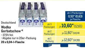 Den Preis von dem Wodka Gorbatschow finden Sie auch oben auf der Website, zusammen mit dem Datum, ab wann das Angebot erhältlich ist. Sie können die Preise auch im aktuellen METRO Prospekt nachhalten oder auf der METRO Website nachschauen. Durch die Angebote können Sie sicher sein, die METRO Produkte zum absoluten Bestpreis zu ergattern.