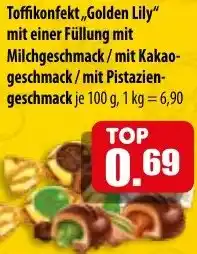 Jetzt im Angebot bei Mix Markt: Toffikonfekt ,,Golden Lily" mit einer Füllung mit Milchgeschmack ✅ Aktion gültig vom 9-03 bis 14-03.